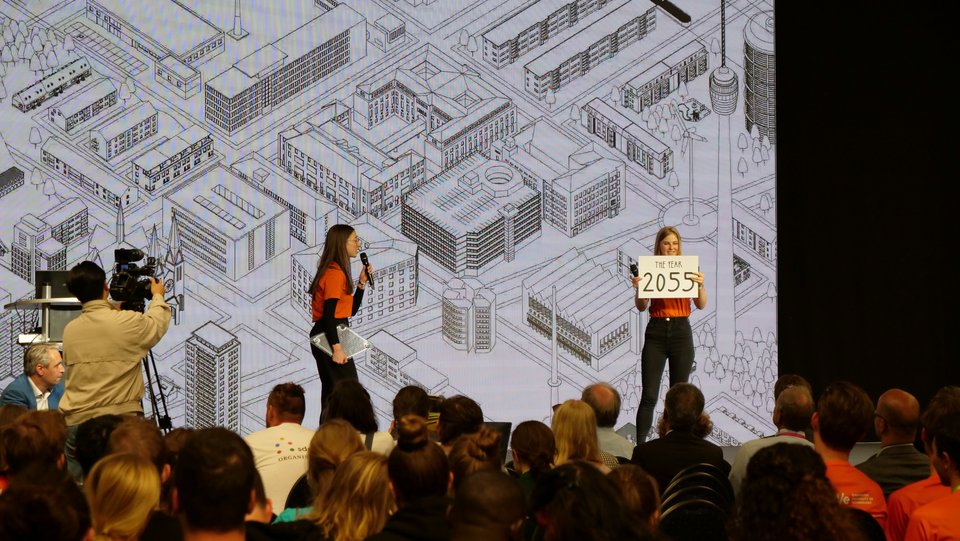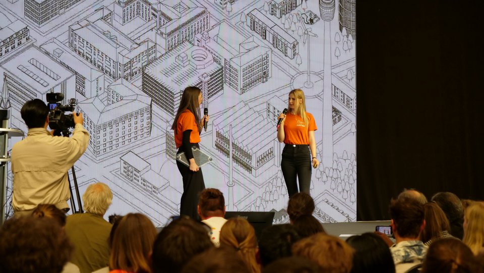 Außerdem stellen alle Teams ihr Projekt in 3 Minuten in einem Pitch vor. Julia und Svenja stehen auf der großen Bühne der Event Halle und stellen unseren Vision der Städte der Zukunft in 2055 vor - als hätten sie noch nie etwas anderes gemacht.