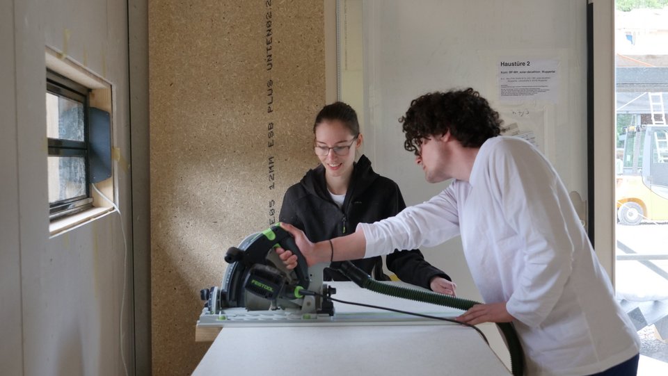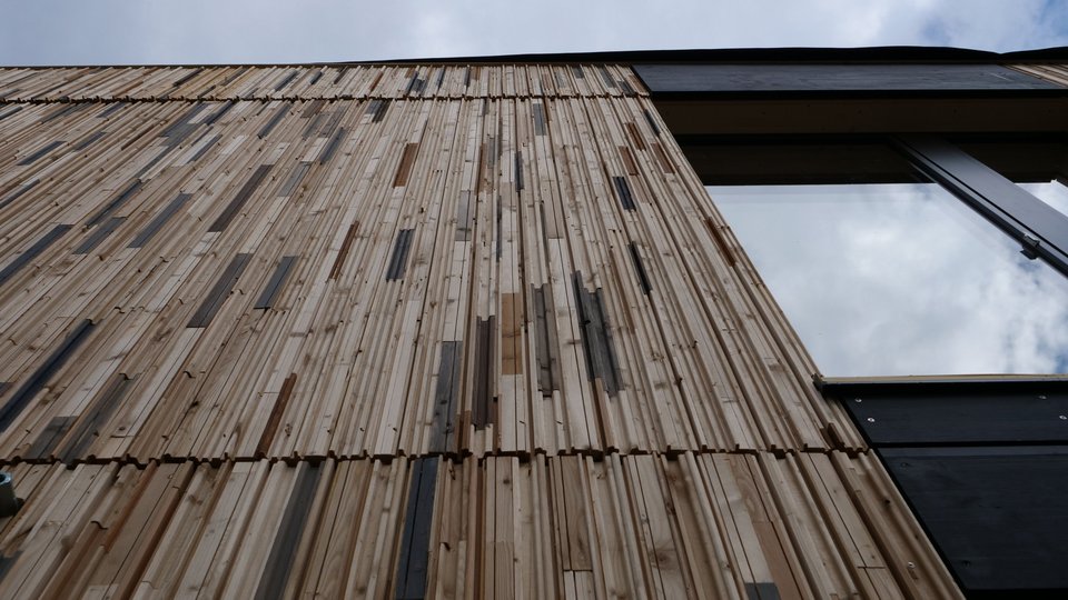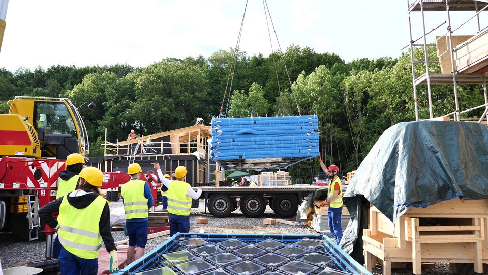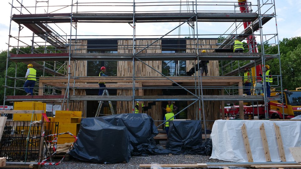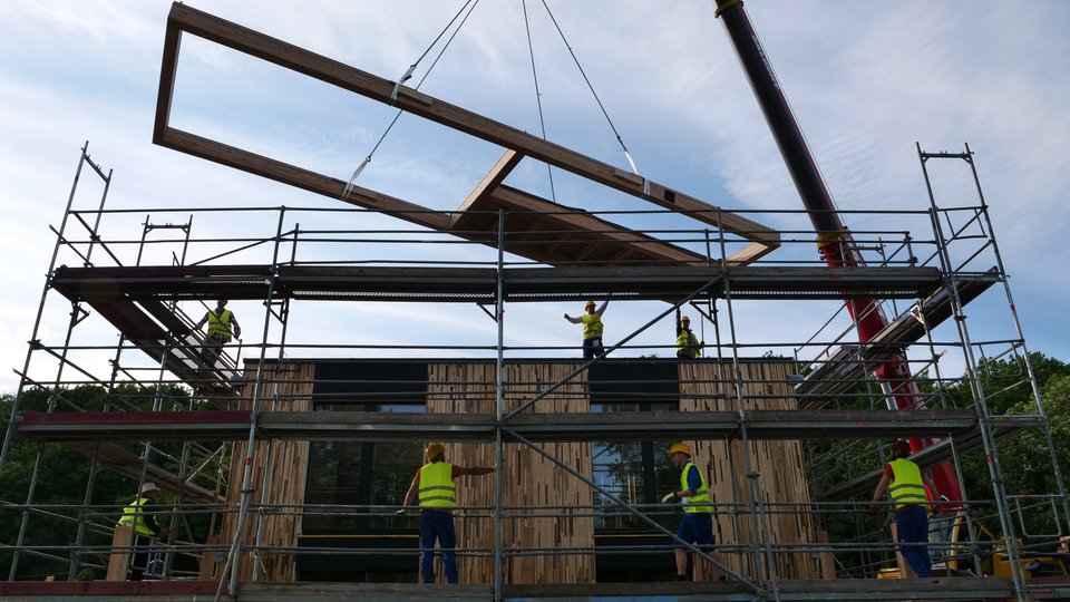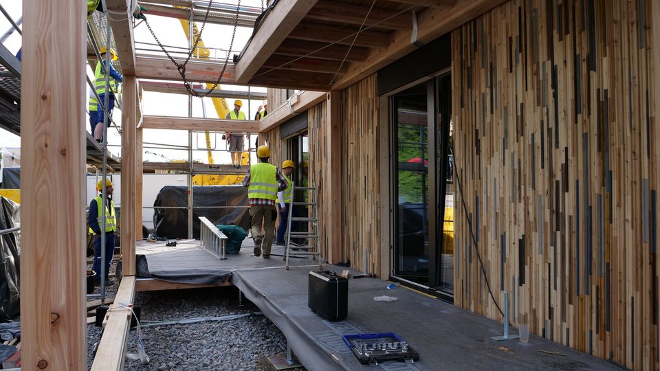 Morgens wird ein Teil des Geländers abgebaut, damit auch die Terrassenkonstruktion an die Fassade passt. Die Schläuche der Adiabaten Kühlung werden noch kurz hinter der Holz Fassade versteckt, während das Attika Fassadenteil schon am Haken hängend über uns schwebt und montiert werden will. Auch der Solarkamin wird in die Aussparung geschraubt. Die thermische Hülle und die Holzfassade stehen jetzt komplett.
