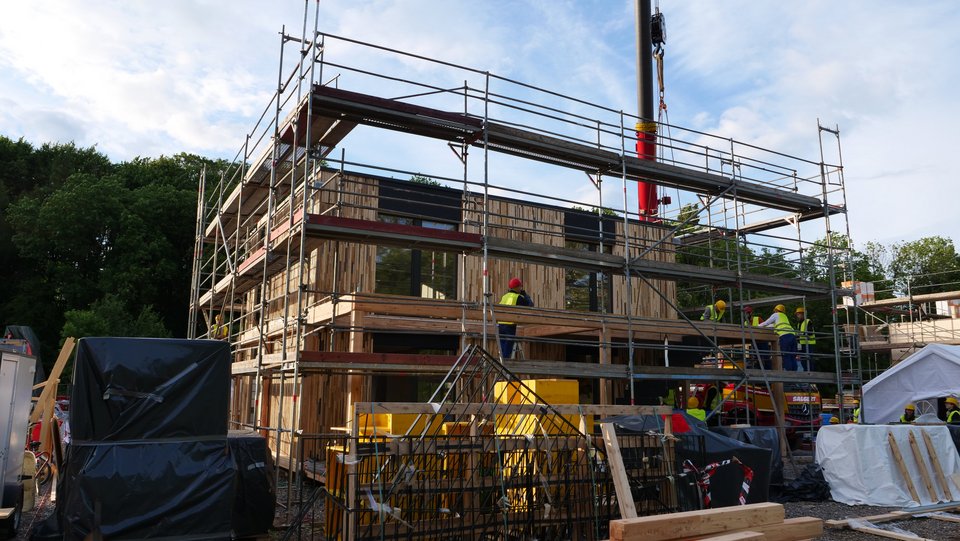 Nach und nach werden Terrassenkonstruktion und Grid vorbereitet. Der immer gut gelaunte Kranführer hebt alle Elemente Zentimetergenau (Millimeter ist hier ja kein Maß, wie wir gelernt haben) über das Gerüst.