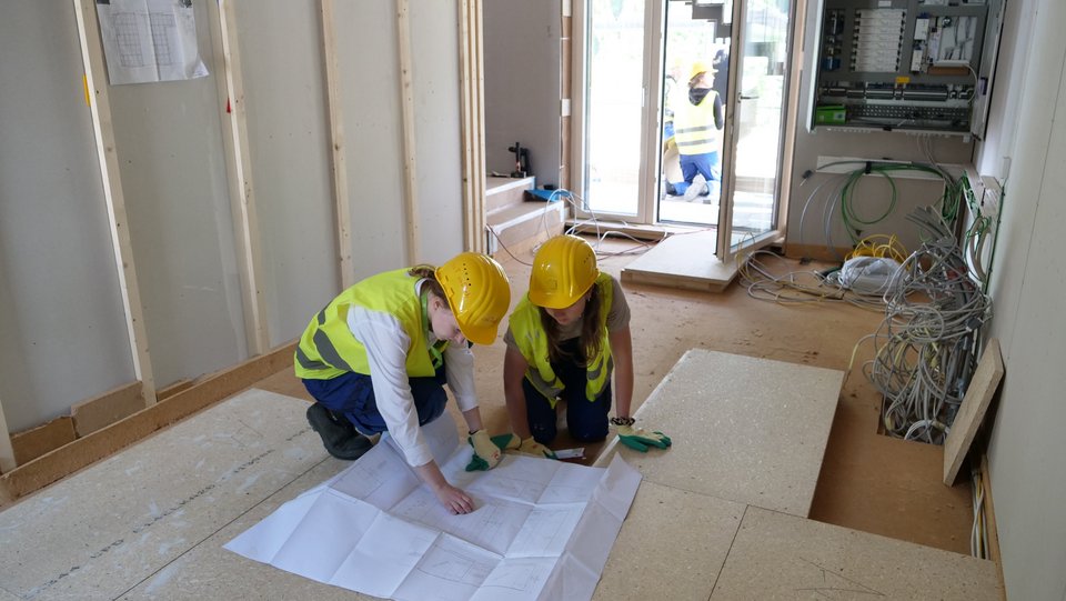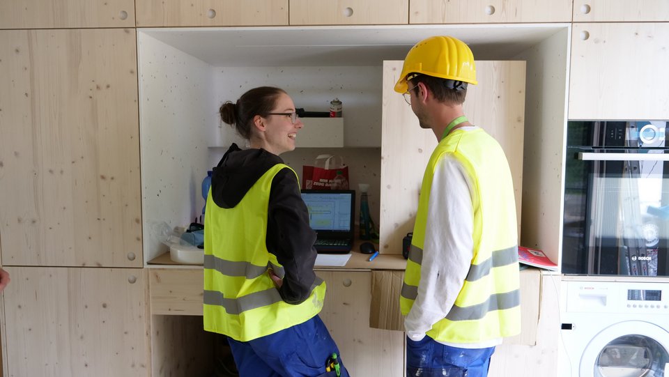 Gleichzeitig arbeitet ein Team durchgehend in der Wohneinheit. Die Spannung steigt, als die Lieferung der Drehkorpen und des Betts ankommt. Viele verschiedene Schnittstellen müssen exakt zusammenpassen, damit der Drehmechanismus funktioniert.