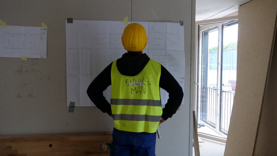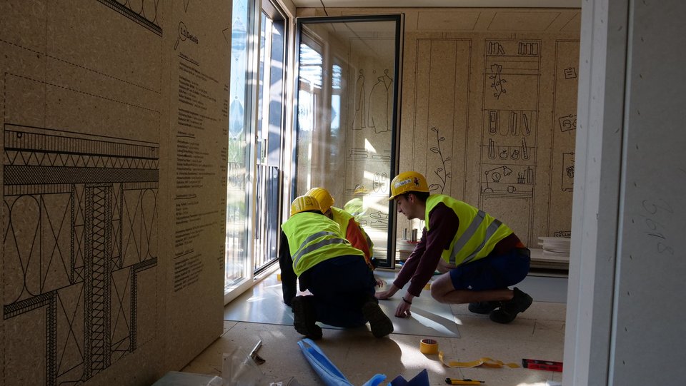 Drei Tage lang werden die vorgefertigten Fußbodenelemente verlegt, Kautschukboden auf die Baustelle nachbestellt und ESB Platten in präzisem Fugenbild an Wand, Boden und Decke montiert. Sobald die Wandplatten zugeschnitten sind, wird der Folienschnitt angebracht und langsam nimmt der Innenraum Gestalt an.