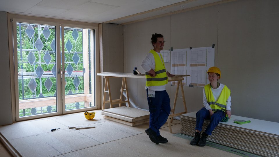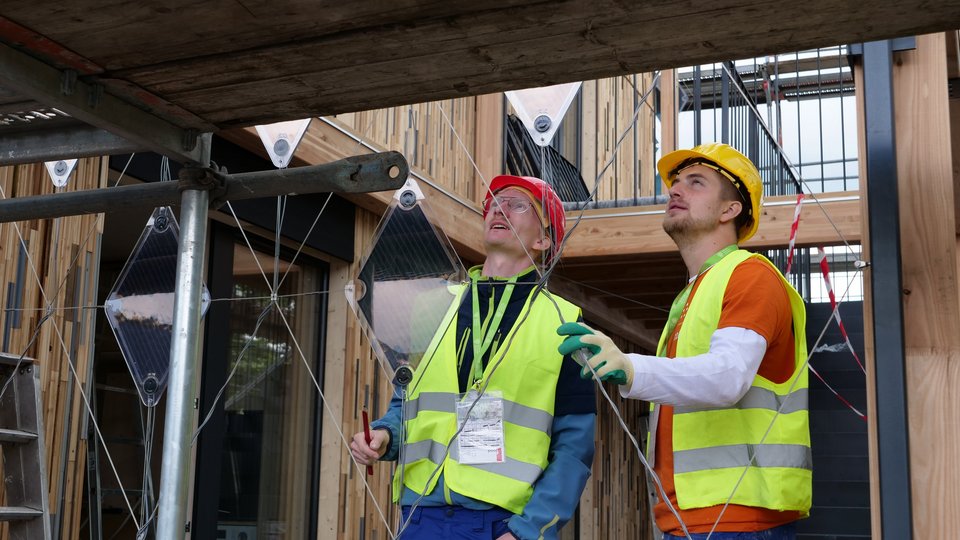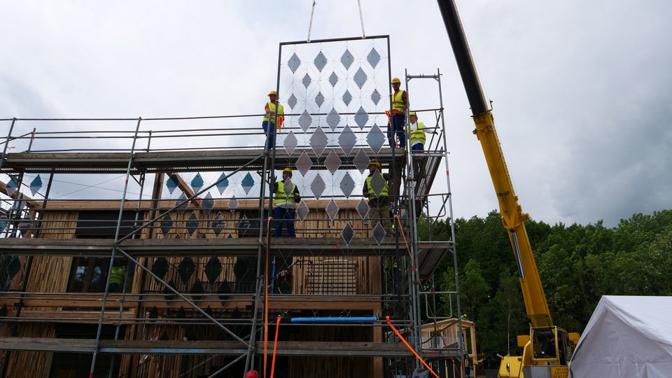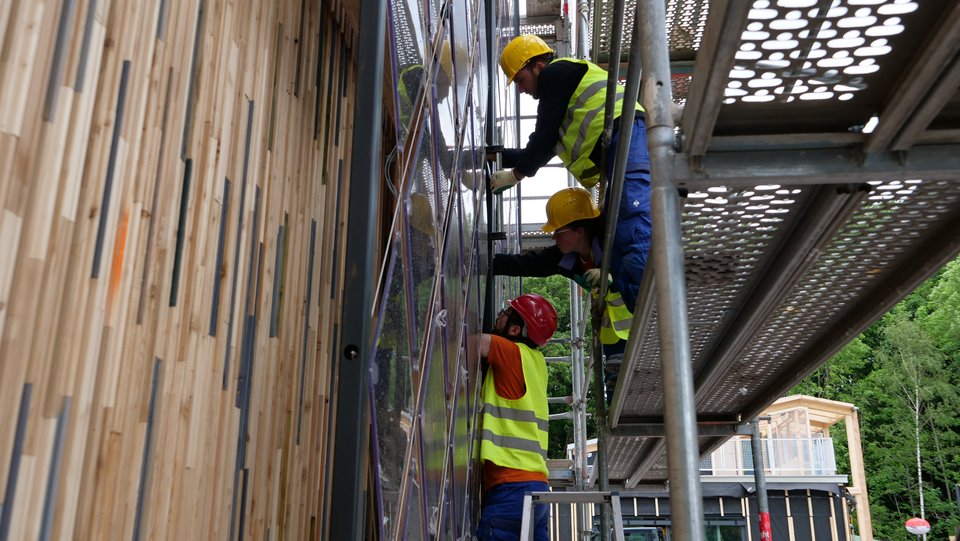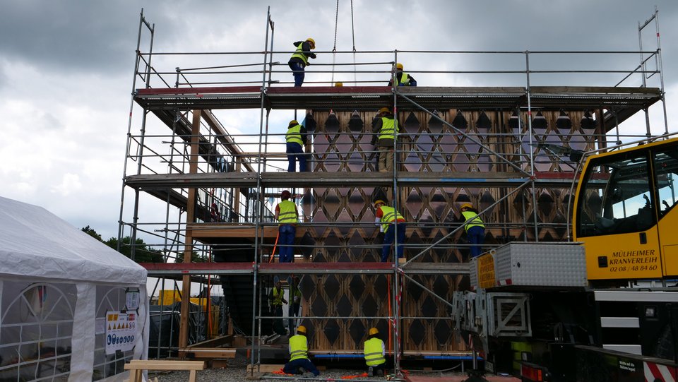 Am Tag 9 werden die restlichen Dachrahmen befestigt und die OPV Fassade steht! Alle sind aus dem Häuschen, wie gut unsere HDU inzwischen aussieht - nämlich besser als auf jedem Redering.