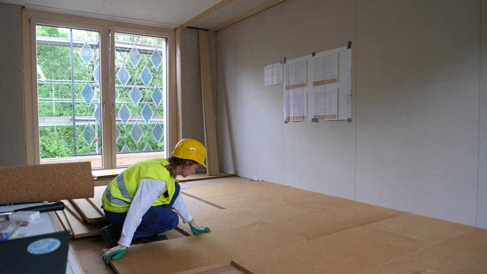 Auch im Innenausbau geht es jetzt mit großen Schritten voran. Decken werden bekleidet und gestrichen, die Fußbodenlemente verlegt. Es zeigt sich schnell: es hat sich mehr als gelohnt so viel Arbeit in die Planung und Vorfertigung des Innenausbaus zu stecken - die vorgefertigten Einzelteile passen perfekt zusammen.