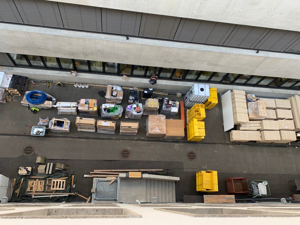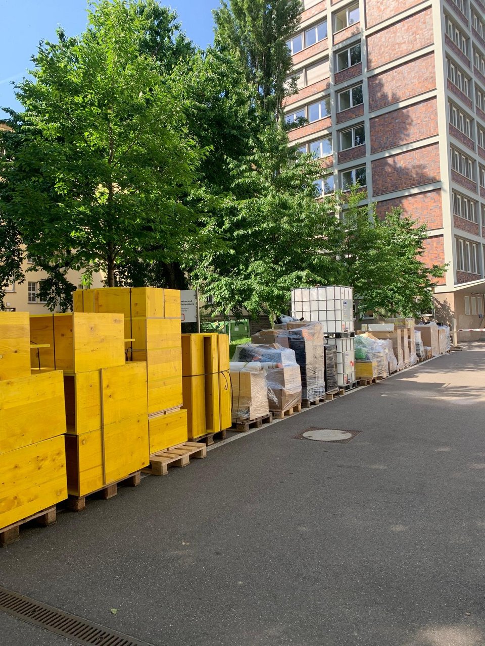 08:00 Uhr: Der Kran ist bereits eingetroffen und die Zelte im Werkstatthof wurden zwischenzeitlich auch abgebaut. Uns erreicht die Nachricht, dass die LKWs erst um 9 Uhr eintreffen werden. Die Zeit wird gut genutzt und wir beginnen die Paletten an den Straßenrand zu bewegen.
